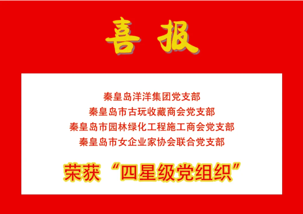 6月27日,秦皇岛市委社会工作部、两新工委印发了《2025年度全市新兴领域“星级党组织”评定结果的通知》(秦非公字【2025】9号),秦皇岛洋洋集团党支部、秦皇岛市古玩收藏商会党支部、秦皇岛市园林绿化工程施工商会党支部、秦皇岛市女企业家协会联合党支部凭借扎实的党建工作、突出的先锋模范作用及优异的工作成效,获评“四星级党组织”荣誉称号。