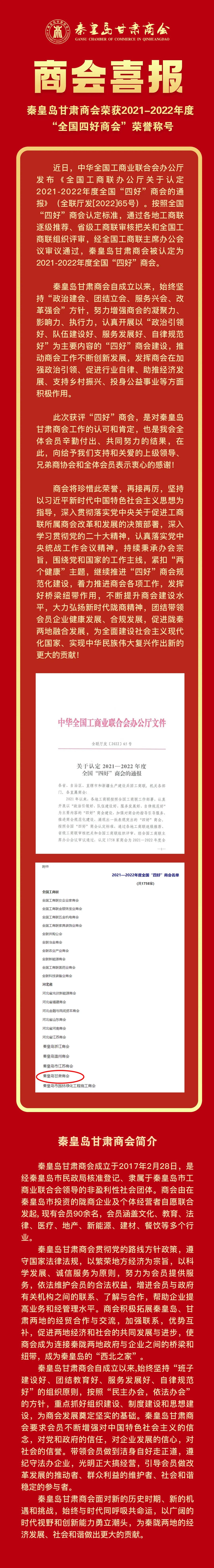 热烈祝贺秦皇岛甘肃商会荣获2021-2022年度“全国四好商会”荣誉称号