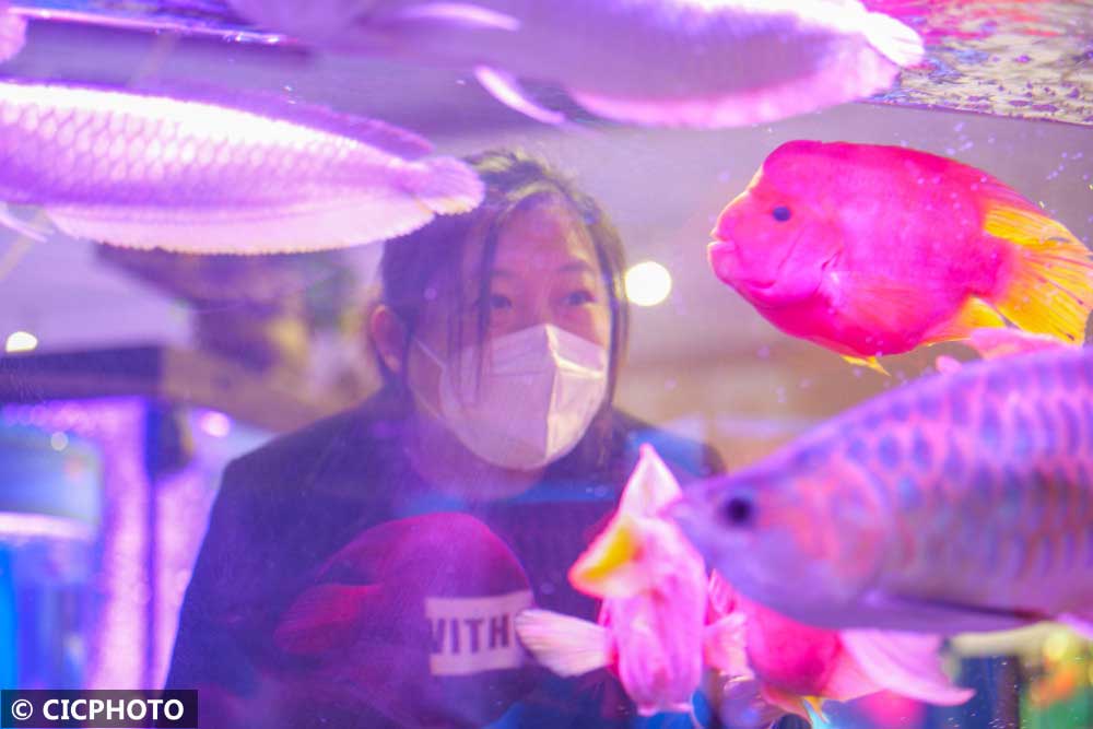 2023年1月11日,市民在河北省秦皇岛市海港区一家花卉市场选购观赏鱼。CICPHOTO/郭楠 摄