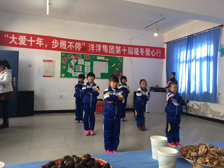 他们是祖国的未来、民族的花朵、洋洋的孩子,爱心捐赠是一项公益性活动,十年来洋洋集团与旗下员工、商户一直关心着学校建设和学生的成长,一年一次的暖冬活动已经形成了大家的一项共同事业,当大家与学生们在一起交流互动时,我们看到了孩子们的期盼,我们内心受到了促动,更感到了那份欣慰。校领导告诉我们九年前洋洋集团捐助的第一批学生现在已经升至初四,明年就要参加中考了,在这些洋洋希望小学的学子中有三名孩子的成绩在全县排名均名列前茅,我们内心充满着自豪与感动。