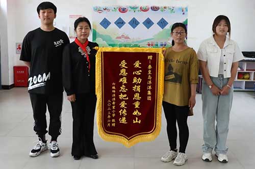 六珠坪洋洋希望小学校长杨晓芬表达了对企业的感谢,特别是对集团董事局刘洋主席的感恩。学校校长和毕业生杨国新、黄紫月共同为集团献上了“爱心助捐恩重如山,受恩难忘把爱传递”的锦旗。杨国新和黄紫月都曾经是六珠坪小学毕业的学生,如今已经就读高中,今天他们早早来到学校,希望能够再次看见当年资助过他们的叔叔阿姨们,同时他们希望能在暑假期间来到集团进行实习实践。