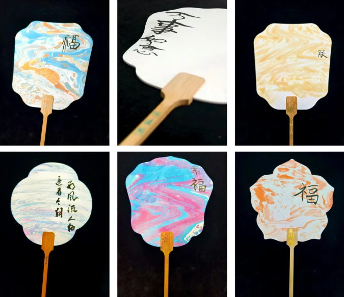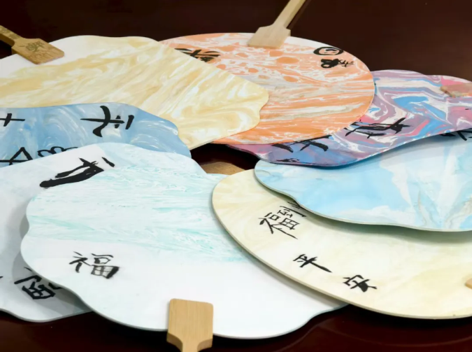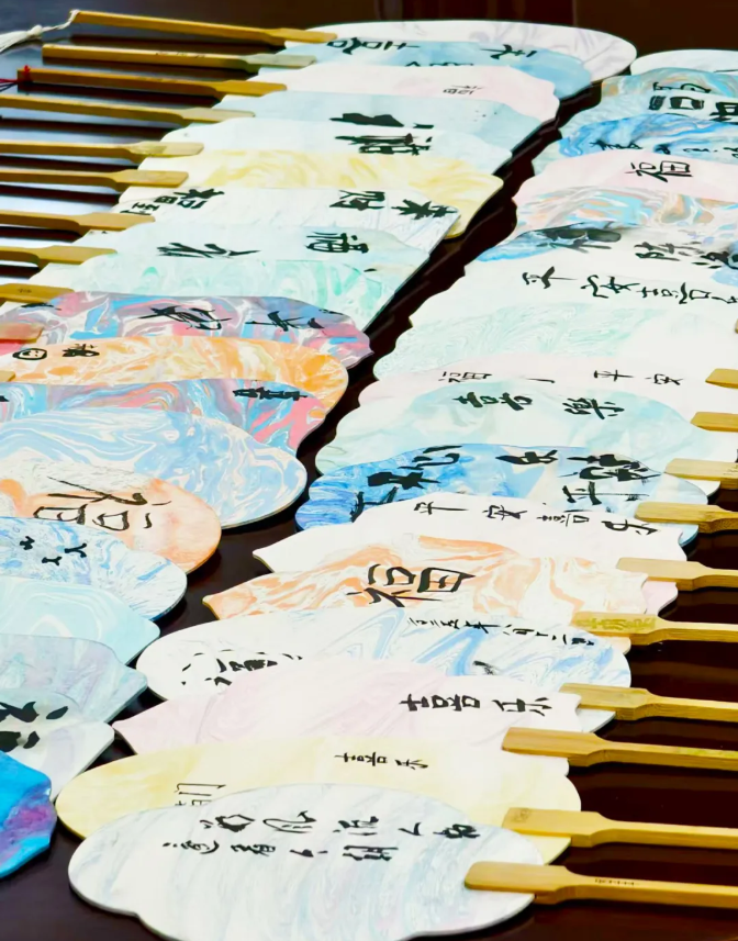 文化洗礼之后,迎来了非遗大漆工艺进阶体验:鎏金嵌贝大漆团扇制作。在专业工艺师和李锋老师的悉心指导下,亲子家庭们重温了大漆的特性与基础技法。孩子们精心在扇子上进行书画,用笔墨点缀。孩子负责充满想象力的书画布局,家长则把控精细的线条描绘。专注的神情、默契的配合,让每一把团扇的制作过程都成为难忘的亲子时光。