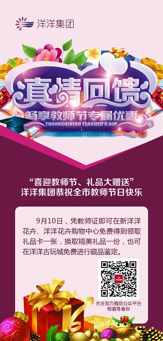 “喜迎教师节、礼品大赠送”,洋洋集团恭祝全市教师节日快乐!9月10日,凭教师证即可在新洋洋花卉、洋洋花卉购物中心免费领取精美礼品一份。也可凭教师证即可在洋洋古玩城免费进行藏品鉴定,机会难得!