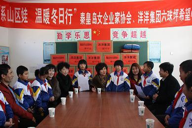 2013年12月9日,洋洋集团携手市女企业家协会开展了“情系山区娃 温暖冬日行”活动。洋洋集团联合市女企业家及洋洋集团商户向六珠坪洋洋希望小学的孩子们捐赠了150多套棉服,给孩子们带去了冬天的温暖,也带去了洋洋人对孩子们深切的问候。